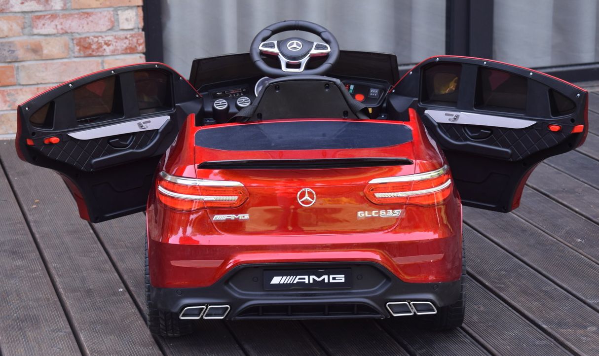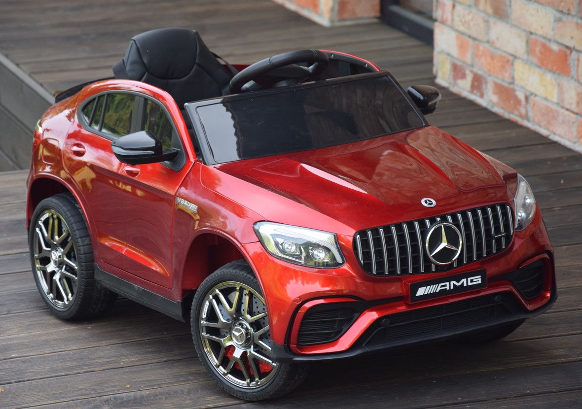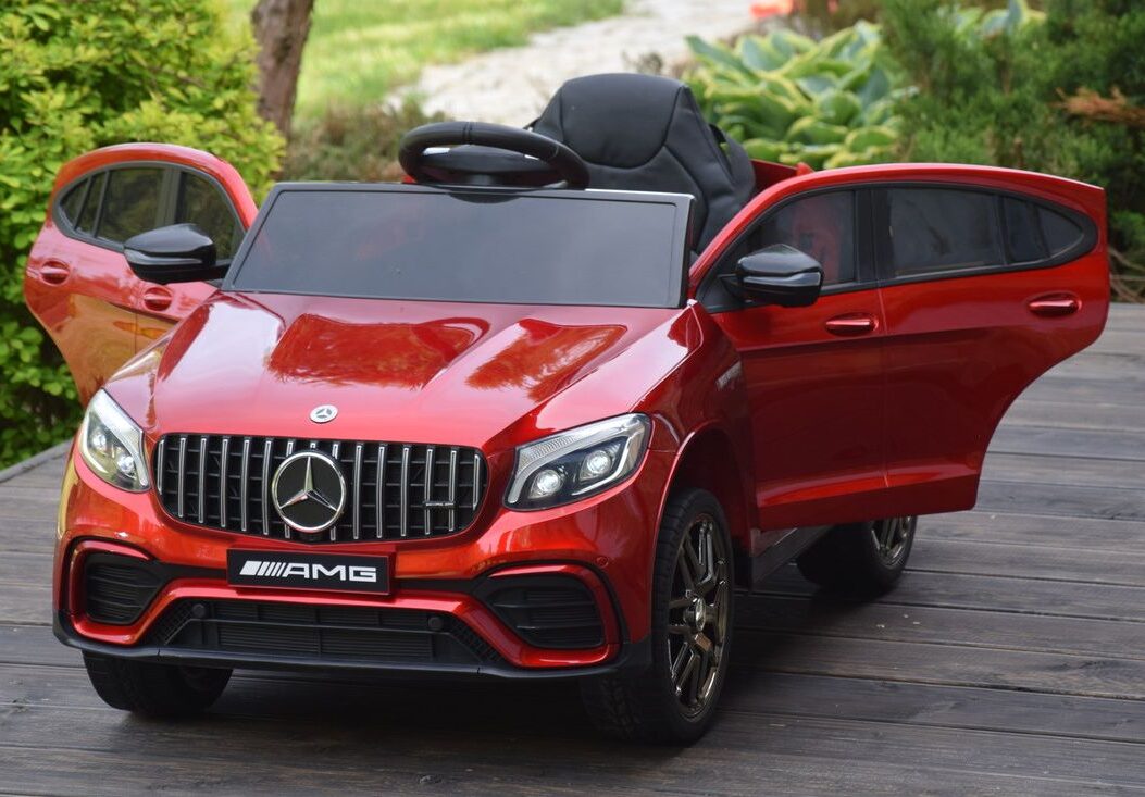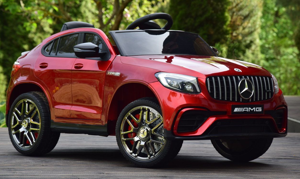 Jednoosobowy Mercedes GLC 63S najnowszy model, najmocniejsza wersja z napędem 4×4 (4 silniki po 45W każdy!) oraz świetne wyposażenie m.in: skórzany fotel, przełącznik napędów, piękna lakierowana bordowa karoseria.