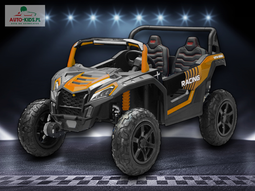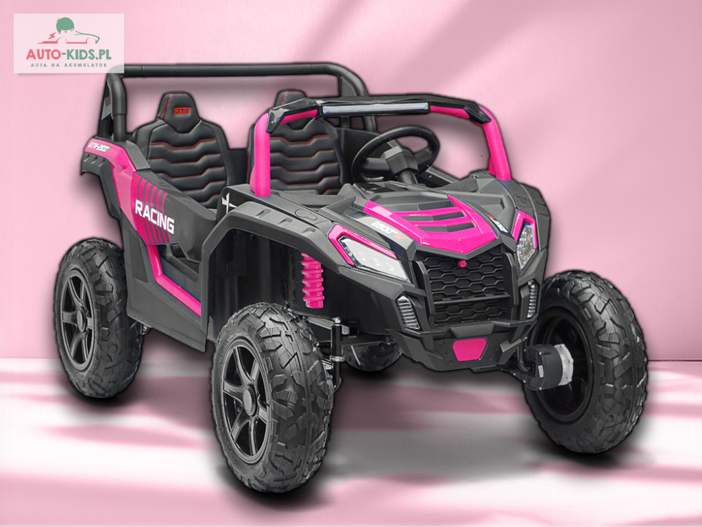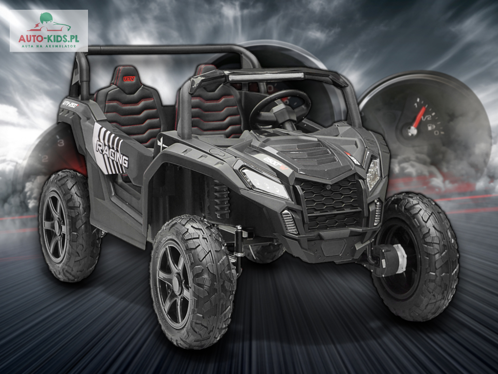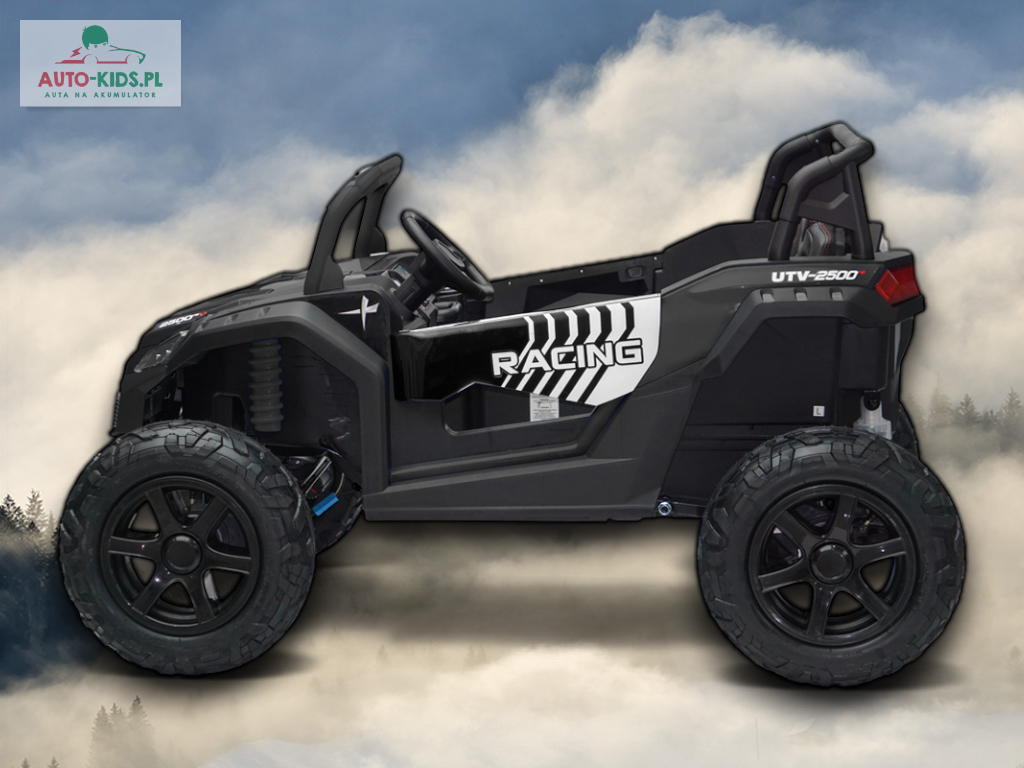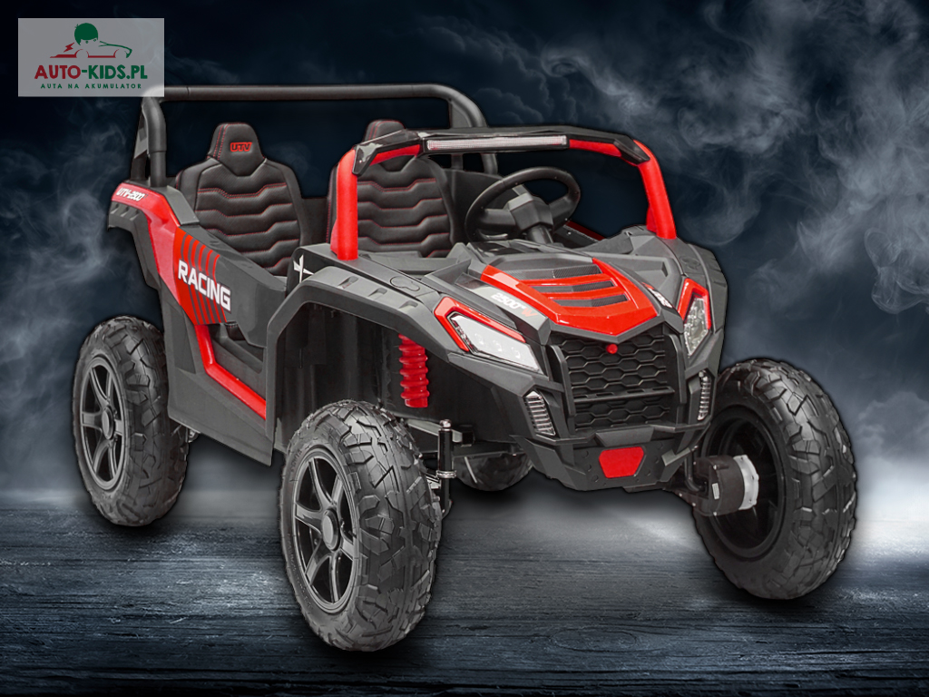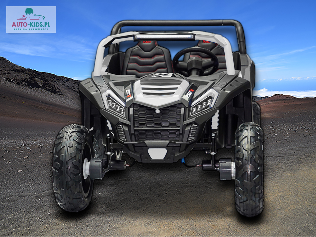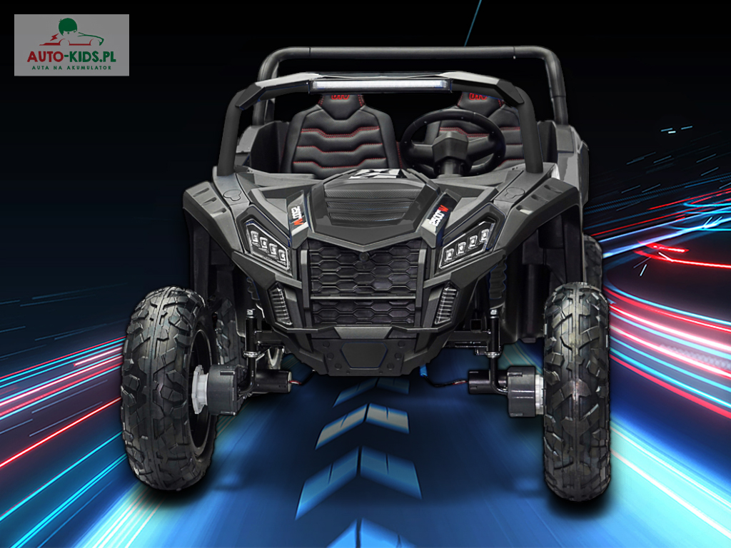 Nowy 2-osobowy terenowy Buggy UTV Racing z pompowanymi kołami, najmocniejszymi silnikami 24V 4x200W i dwa fabrycznie powiększone akumulatory 12V20Ah, dające razem 24V20Ah! Dodatkowo wzmocniona, metalowa przednia oś!