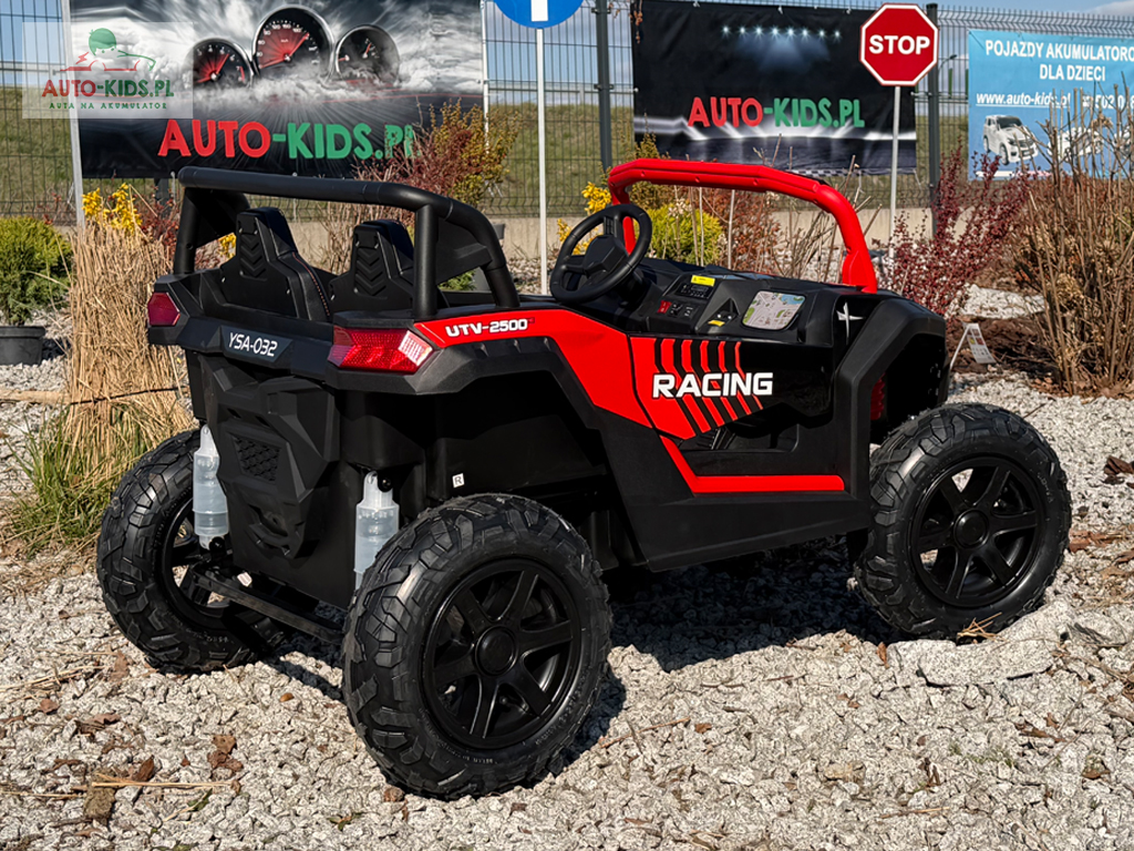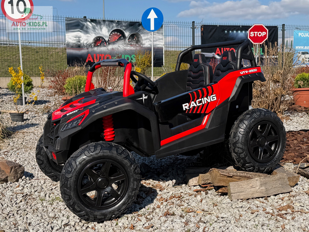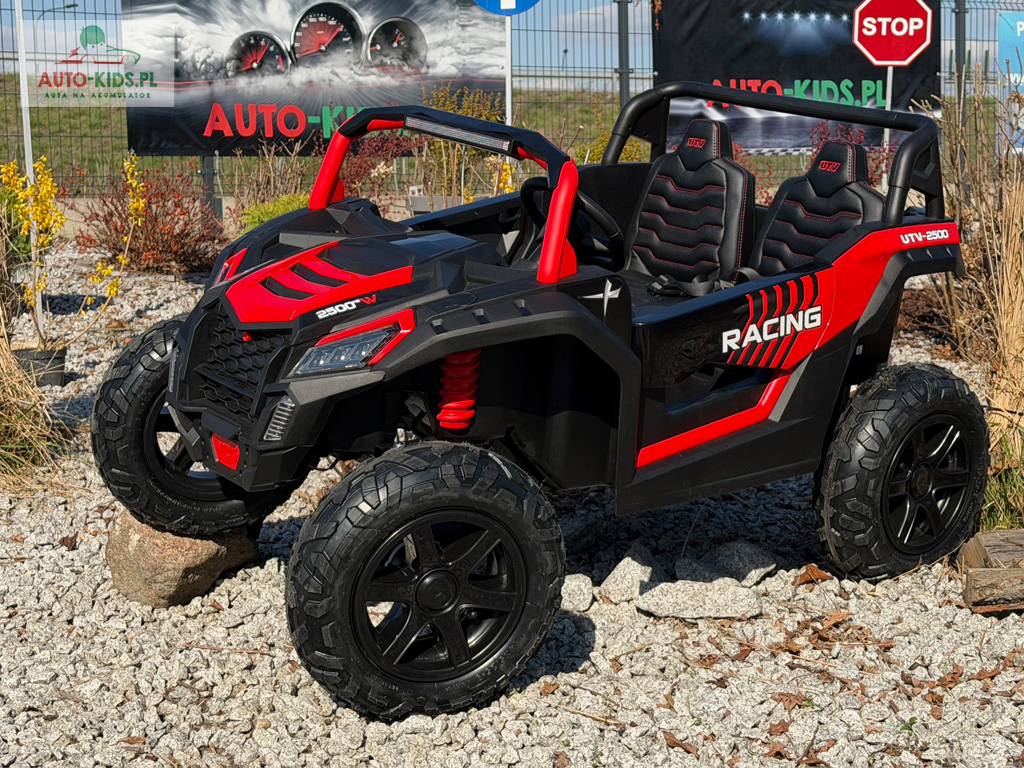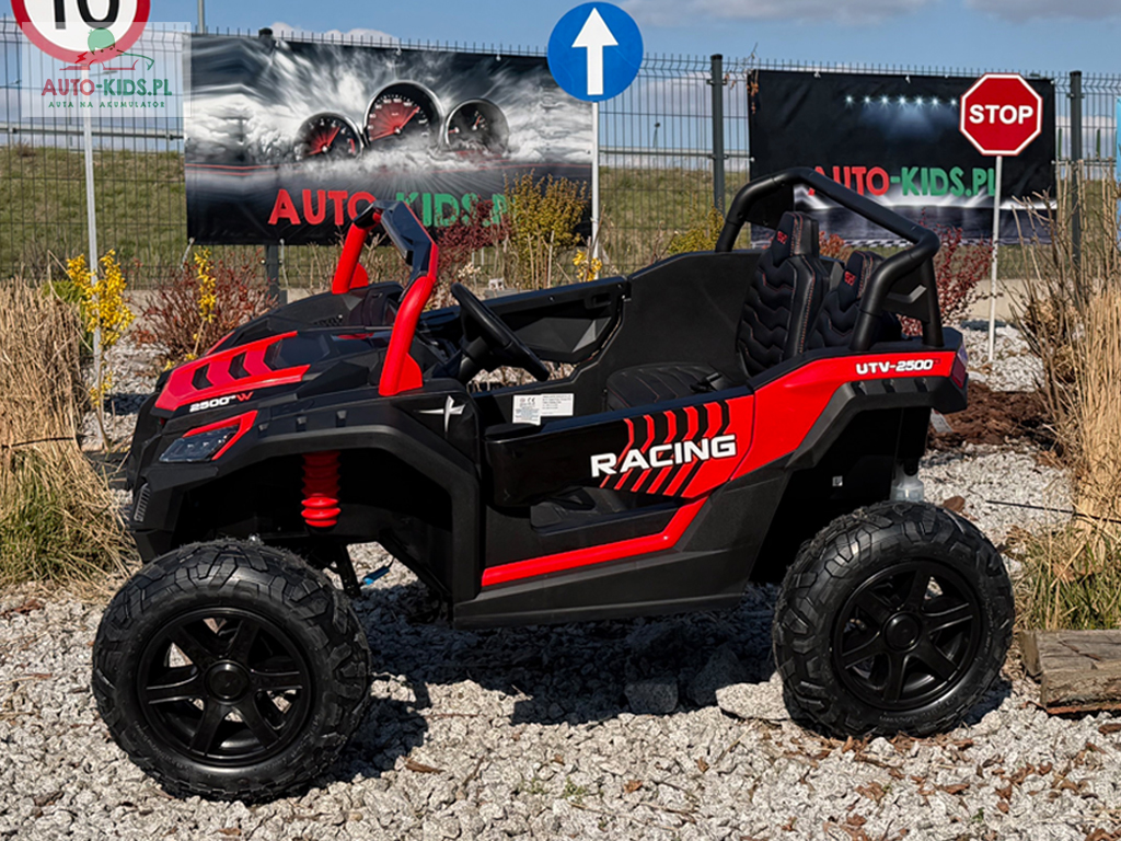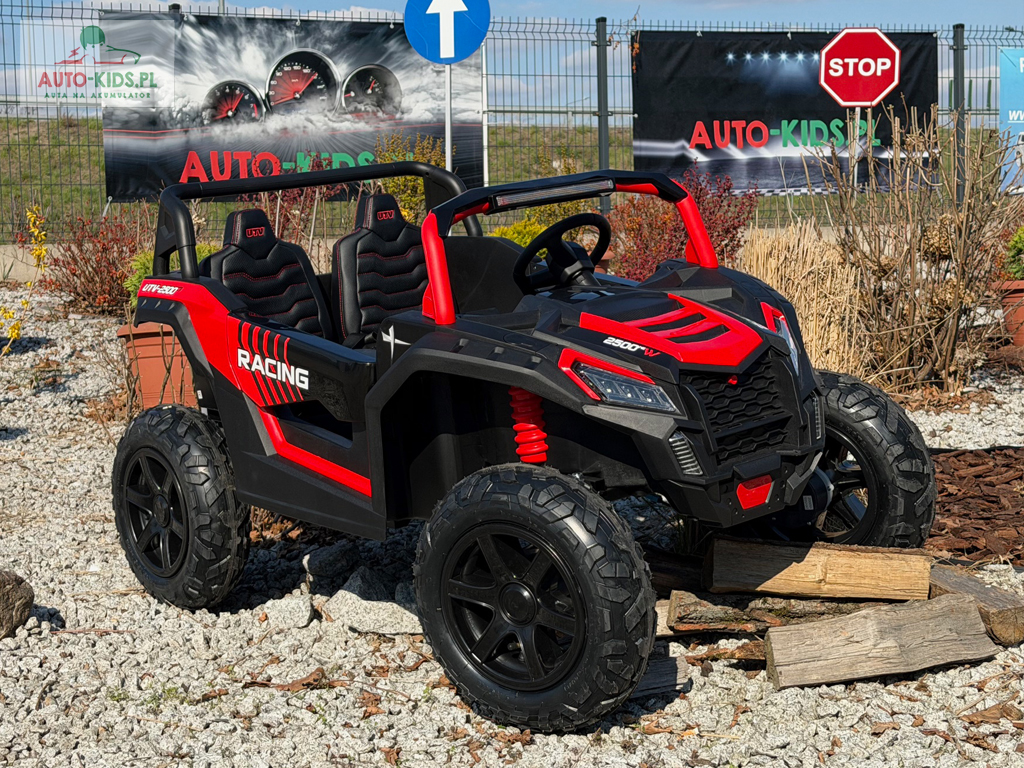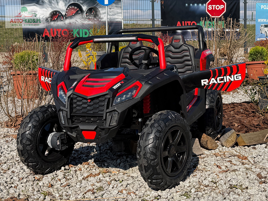 Nowy 2-osobowy terenowy Buggy UTV Racing z pompowanymi kołami, najmocniejszymi silnikami 24V 4x200W i dwa fabrycznie powiększone akumulatory 12V20Ah, dające razem 24V20Ah! Dodatkowo wzmocniona, metalowa przednia oś!