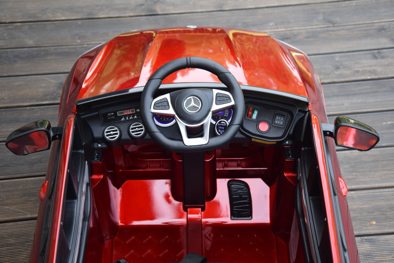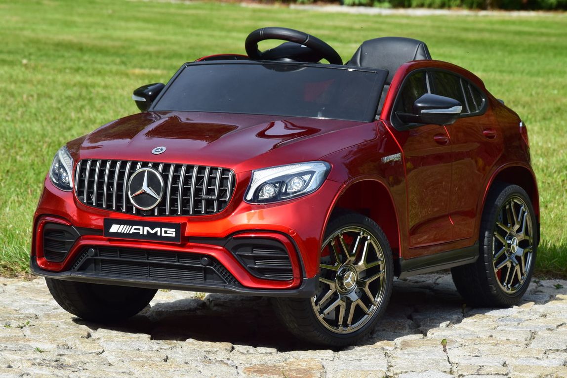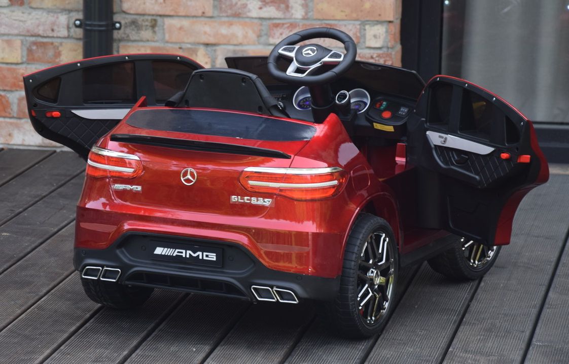 Jednoosobowy Mercedes GLC 63S najnowszy model, najmocniejsza wersja z napędem 4×4 (4 silniki po 45W każdy!) oraz świetne wyposażenie m.in: skórzany fotel, przełącznik napędów, piękna lakierowana bordowa karoseria. Powiększony akumulator 12V 9Ah – to dłuższy czas jazdy na jednym ładowaniu!