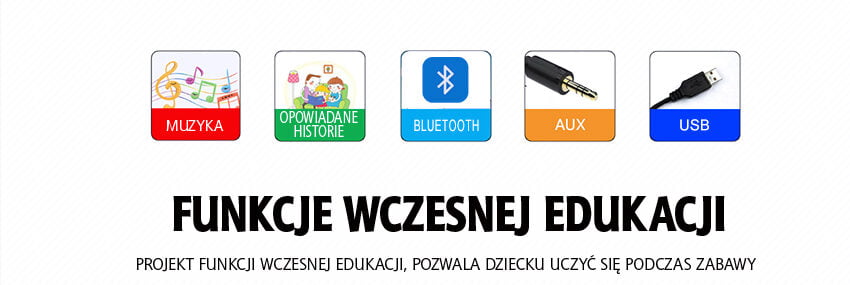 – w pamięci auta wgranych jest wiele piosenek, melodii oraz bajki i opowiadania po angielsku (edukacja podczas zabawy)