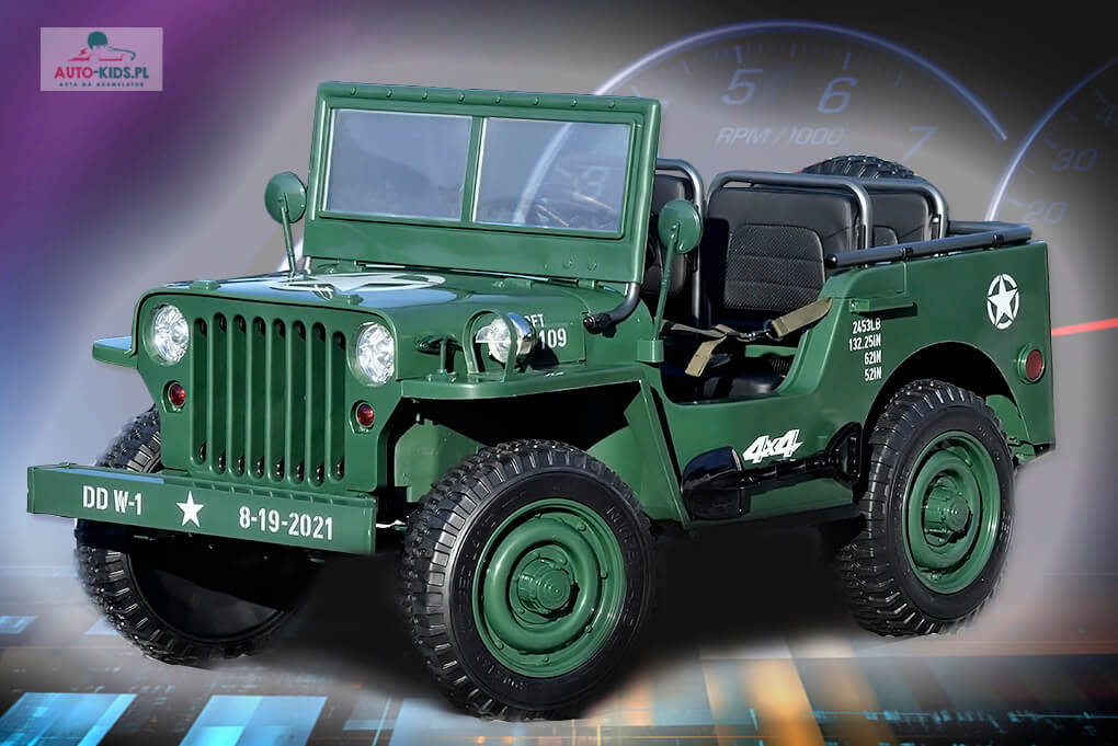 Pojazd Wojskowy Jeep Willys 3-Osob. Wersja Premium 4x200W! 2x24V 20Ah! CIEMNO-ZIELONY