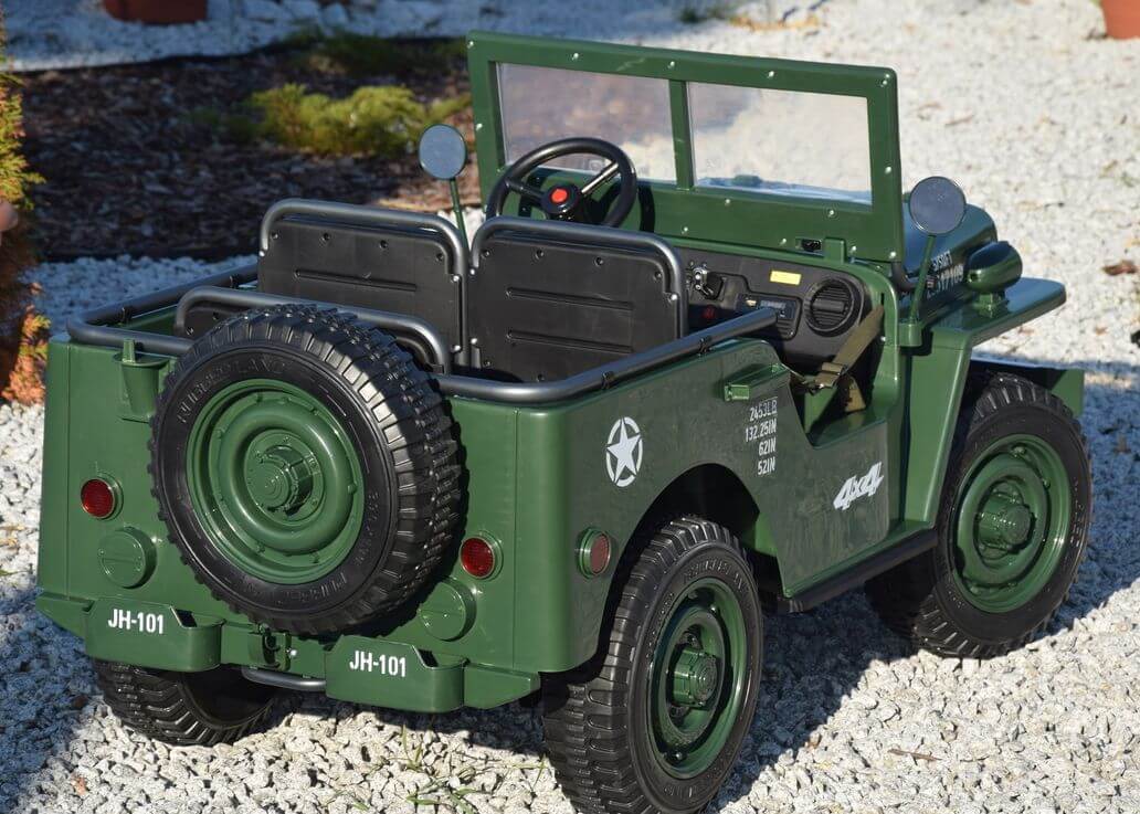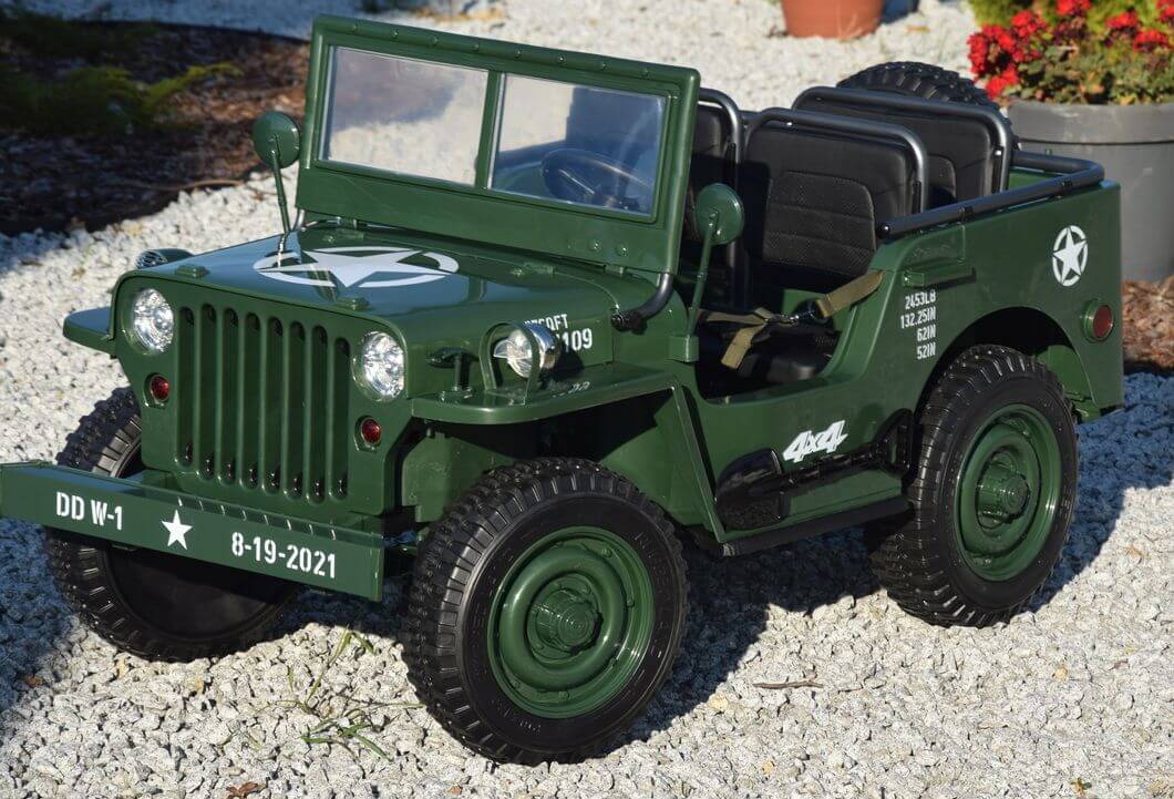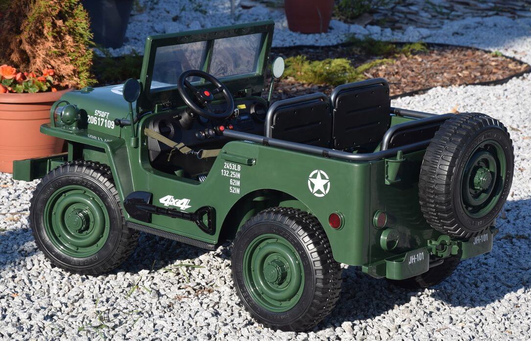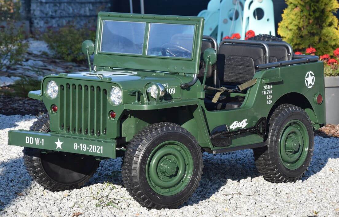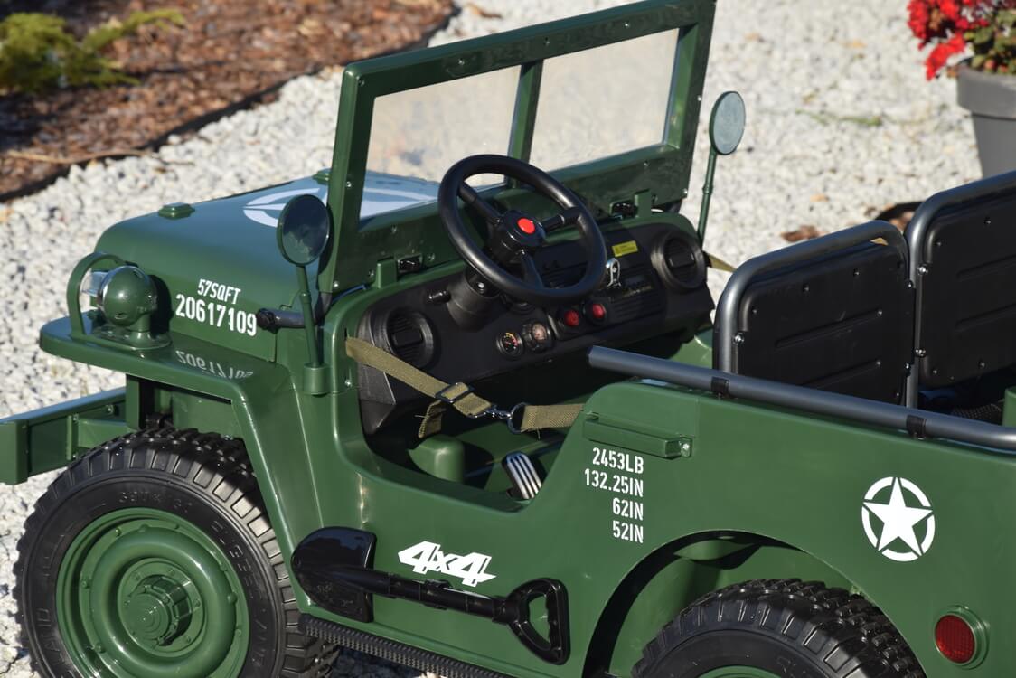 Ogromny Jeep Willys 3-OSOBOWY! z napędem 4×4, jedyny Jeep 3-osobowy! PODWÓJNY AKUMULATOR 24V o pojemności 20Ah! zapewnia długi czas jazdy!