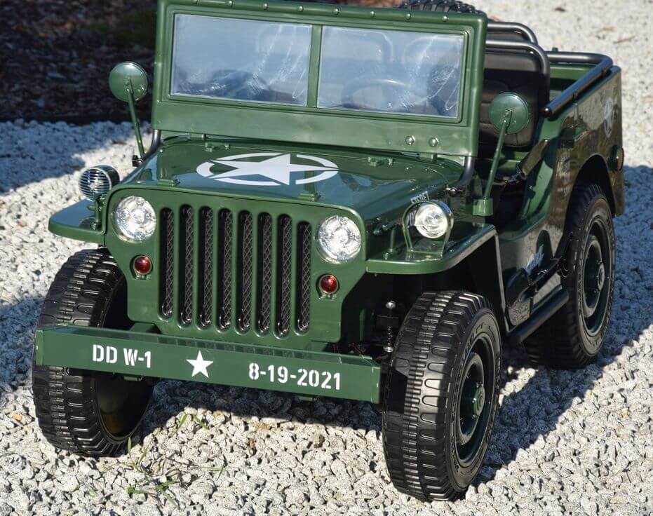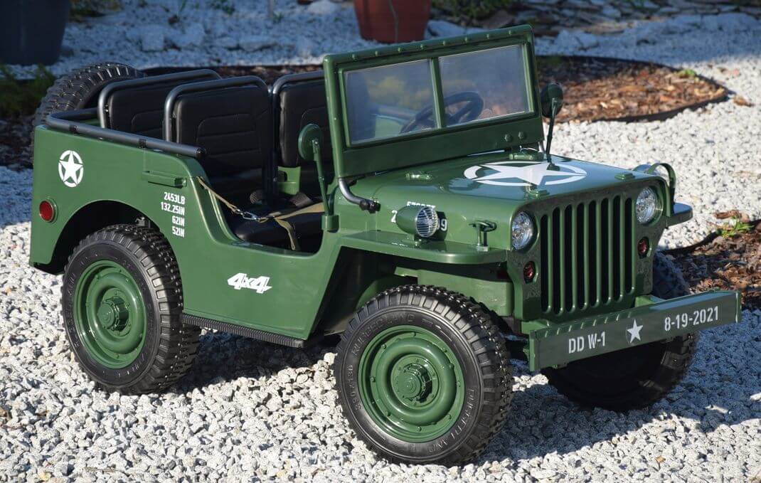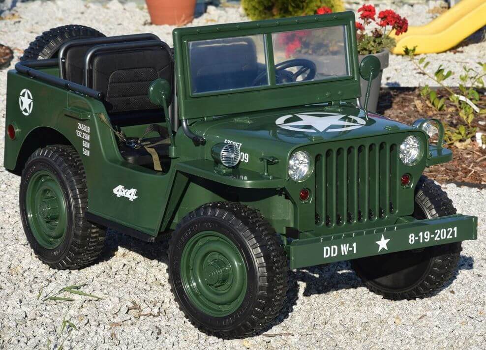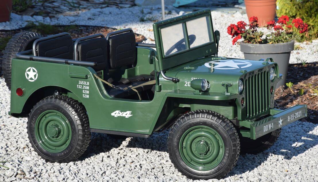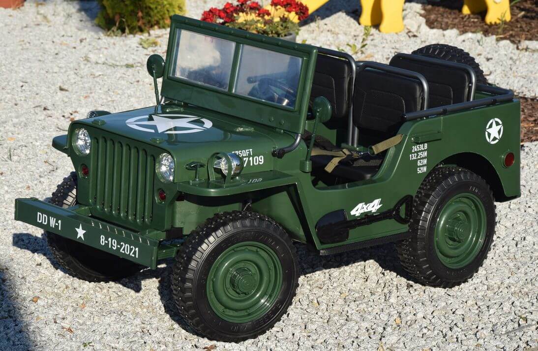 Ogromny Jeep Willys 3-OSOBOWY! z napędem 4×4, jedyny Jeep 3-osobowy! PODWÓJNY AKUMULATOR 24V o pojemności 20Ah! zapewnia długi czas jazdy!