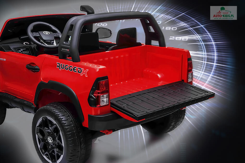 Pick-up, który zapewni wiele godzin frajdy małym fanom motoryzacji. 2 skórzane fotele oraz miękkie koła z pianki EVA sprawiają, że Toyota Hilux należy do aut klasy premium! Duży bagażnik pod przednią maską oraz otwierana tylna paka znacznie zwiększają możliwości zabawy. Najbogatsza wersja wyposażenia! Napęd 4×4 800W! i 2 powiększone akumulatory 24V 10Ah (razem 20Ah)! Bardzo długi czas jazdy!