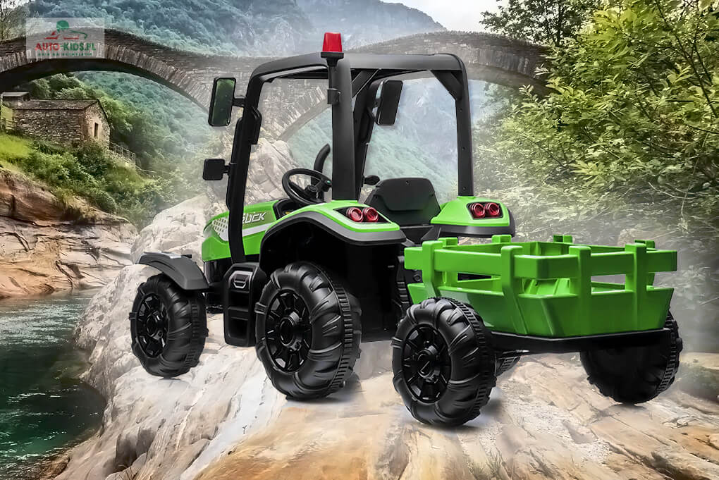 Bogate wyposażenie ze skórzanym fotelem, panelem multimedialnym (USB + Bluetooth) i piankowymi kołami EVA to gwarancja udanego prezentu dla twojej pociechy i wiele godzin niezapomnianej zabawy młodego farmera! W zestawie również szybka ładowarka 24V!